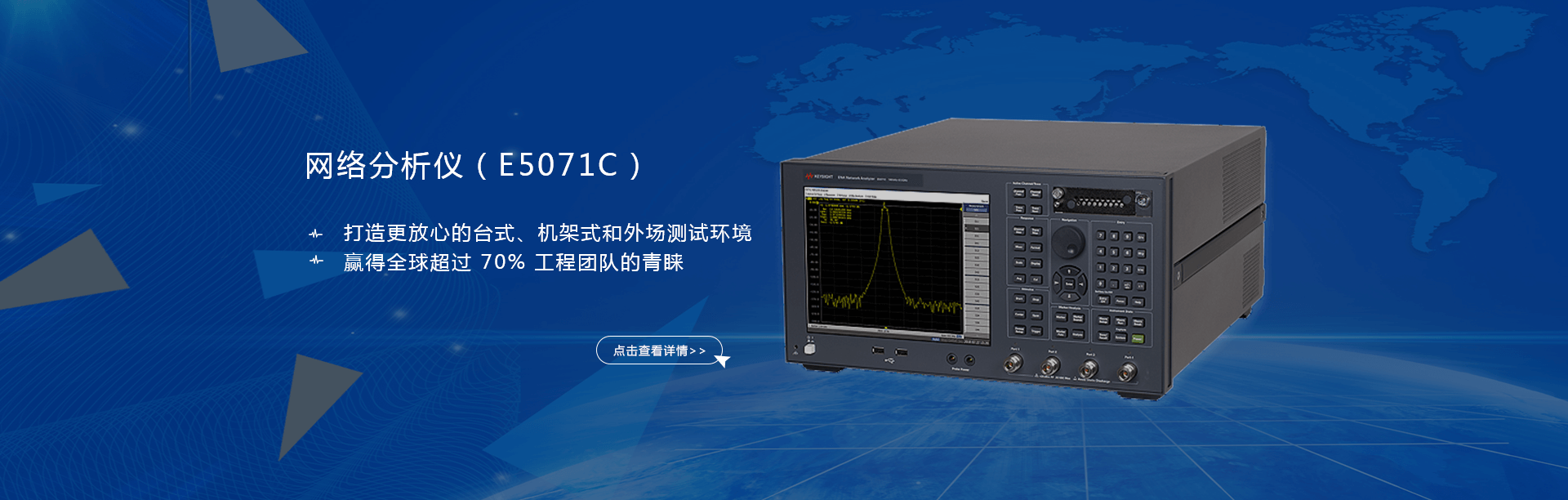 主要產(chǎn)品有:頻譜分析儀,網(wǎng)絡(luò)分析儀,綜合測試儀,藍(lán)牙wifi測試儀,噪聲系數(shù)測試儀,接收機(jī),電話測試儀,高、低頻信號源,音、視頻信號分析儀,高精度萬用表, LCR/ 電橋、各種通信電源等。經(jīng)營的儀器品牌主要有:Keysight/Agilent (惠普 / 安捷倫)、 R/S (羅德 & 施瓦茨)、 Anritsu (安立)、Litepoint、 FLUK( 福祿克 ) 、 TEK (泰克)等。